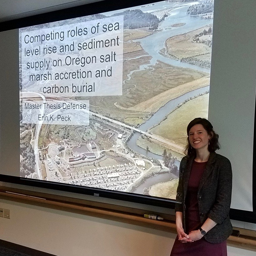 ARCS Scholar, Erin Peck, College of Earth, Ocean, and Atmospheric Sciences, OSU, presented her Master Thesis Defense on "Competing Roles of Sea Level Rise and Sediment Supply on Oregon Salt March Accretion and Carbon Burial." Accelerated sea level rise and human landscape alteration threaten the persistence of salt marshes along the Oregon Coast. However, these estuarine environments provide important ecosystem services, such as carbon sequestration, nursery grounds for economically and culturally important fish and shellfish, biogeochemical filtration of sediment, nutrients, and pollutants, storm protection, and recreation. Erin’s research seeks to assess the vulnerability of Oregon salt marshes to drowning under rising seas, changing climate, and intensified human impact. Additionally she is interested in quantifying carbon sequestration within these highly productive environments.